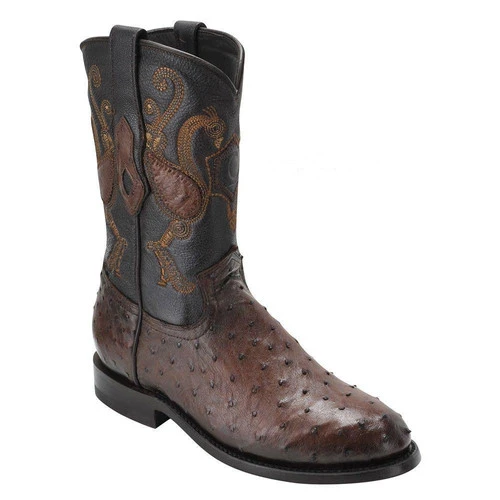 Genuine full ostrich leather roper boots. Â Hand-painted foot & hand-stitched details on leather upper.