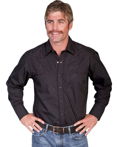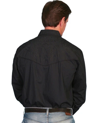 - Back yoke accented in fancy scroll embroidery