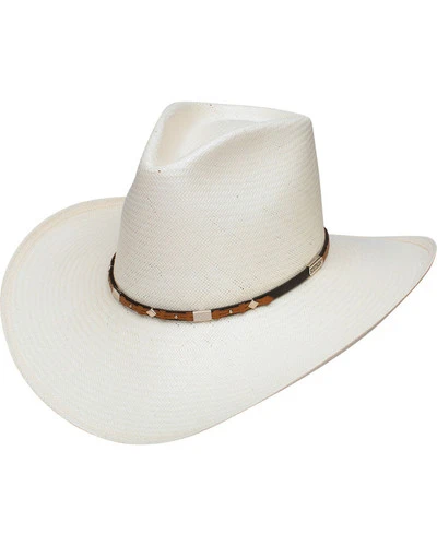 - Keep your cool in the hot summer sun with this great western hat from the iconic Stetson. It features 8X straw construction with a decorative hatband featuring silver tone accents and Stetson slider. The 4″ brim will keep your face and neck protected from the sun, in or out of the saddle. Step out in true western fashion with Stetson.